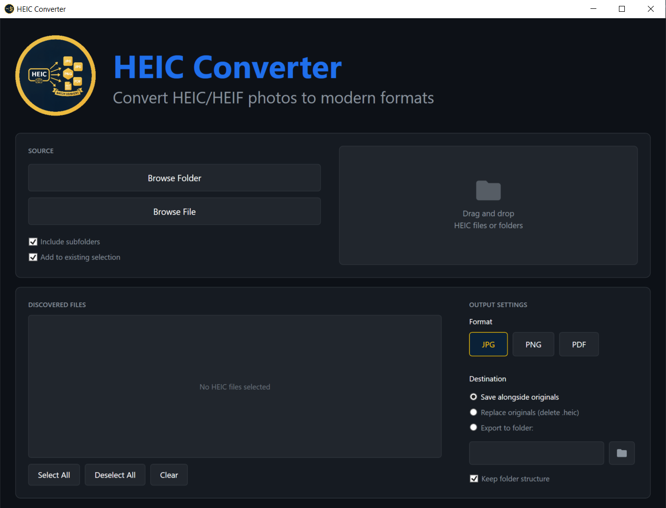 Drag and drop entire folders. HEIC Converter recursively scans all subfolders and converts everything.